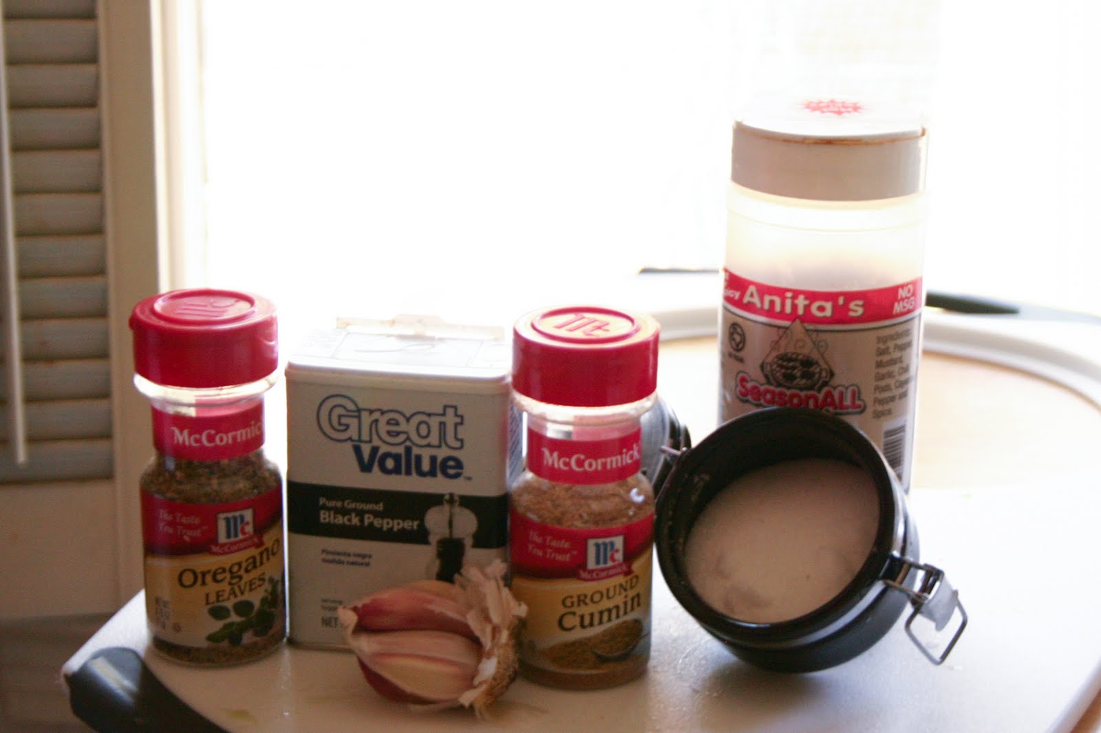 | Oregano, Black Pepper, Garlic, Cumin, Salt, & Anita's (Hanz's family's recipe) Season All |