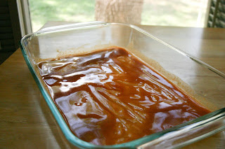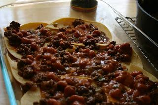 Cover the bottom of the baking dish (I used a 9x13 glass dish) with the reserved enchilada sauce.