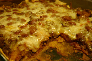 | Corn tortillas, bell pepper, Monterrey Jack cheese, jalapenos, Ranch Style beans, Onion, & Enchilada Sauce |