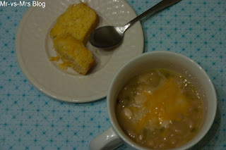 Heat up a large pot (to medium heat) and throw in your oil. Add in onion, jalapeno, and season with salt, pepper and cumin. Cook until onions are almost translucent. Season chicken with a pinch of salt & a little pepper. Put onion & jalapeno mixture around the side of your pot and throw in the chicken & let it brown a bit. Stir it around until all sides are cooked (3-4 minutes). Throw in your beans (drain 1 of the cans), green chiles, stir, and then add in chicken stock until everything moves freely in the pot. Season with garlic powder (couple of dashes), cumin (1 1/2 tbsp), and a couple of dashes of cayenne pepper. Bring to a boil and then allow to simmer as long as you want (I did for about 30 minutes). To serve, ladle soup into bowl, top with monterrey/colby jack cheese & enjoy! I made a loaf of corn bread and topped it with some cheese just before taking it out of the oven.